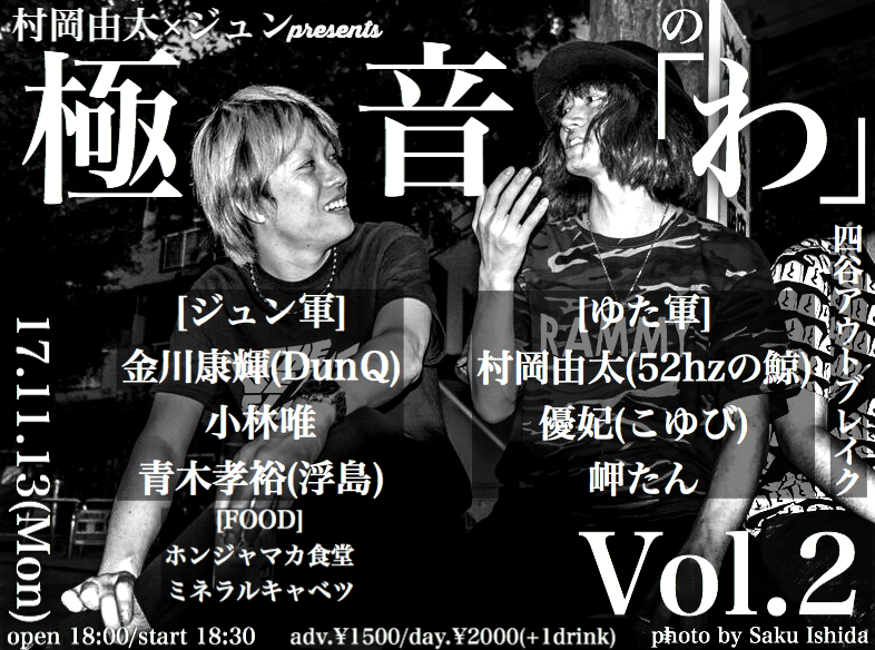 出演者 [ゆた軍] 村岡由太(52hzの鯨) 岬たん 優妃(こゆび) [ジュン軍] 金川康輝(DunQ) 青木孝裕 小林唯 [FOOD] ホンジャマカ食堂 ミネラルキャベツ OPEN 18:00 / START 18:30