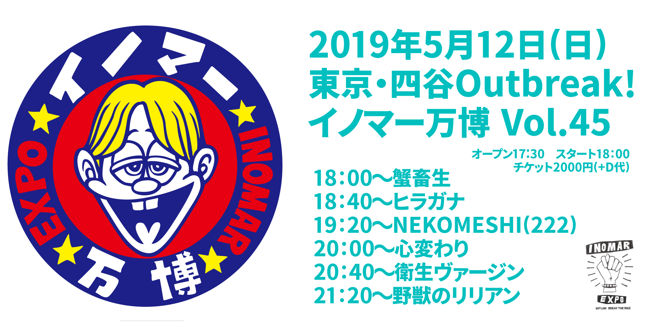 出演者 NEKOMESHI(222) 蟹畜生 野獣のリリアン ヒラガナ 心変わり 衛生ヴァージン OPEN 17:30 / START 18:00