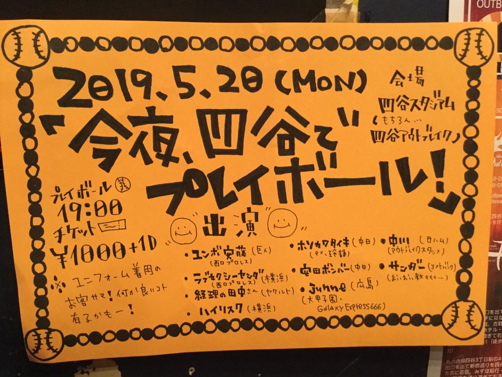 出演者 ユンボ安藤(巨人) ラブセクシーヤング(横浜) 経理の田中さん(ヤクルト) ハイリスク(横浜) ホソカワタイキ(中日) 安田ボンバー(中日) junne(広島) 中川(日ハム) サンダー(ソフトバンク) OPEN 18:30 / START 19:00