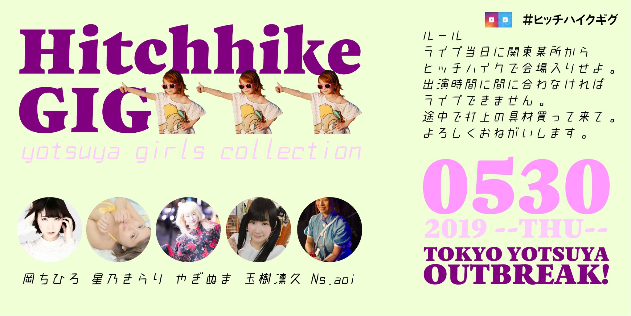 ★四谷名物ヒッチハイクギグ、今回は女性アーティスト特集! お昼12時に関東某所(場所は当日発表)からスタートし 出演時間までにヒッチハイクで会場まで到着せよ!! ヒッチハイクの模様は #ヒッチハイクギグ で実況中継!! (各アーティスト男性スタッフ1名が同行します)