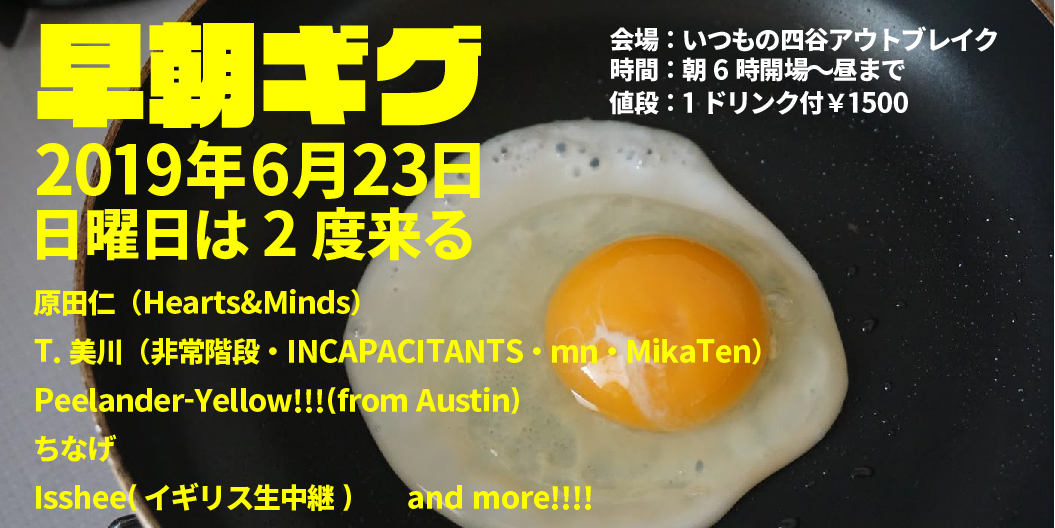 出演者 ハラダショーゴ(原田仁+原口承悟) T.美川(非常階段・INCAPACITANTS・mn・MikaTen) Peelander-Yellow!!!(from Austin) ちなげ isshee(b:TRANSPARENTZ、共犯者) DSM-XXX OPEN 06:00 / START 06:30