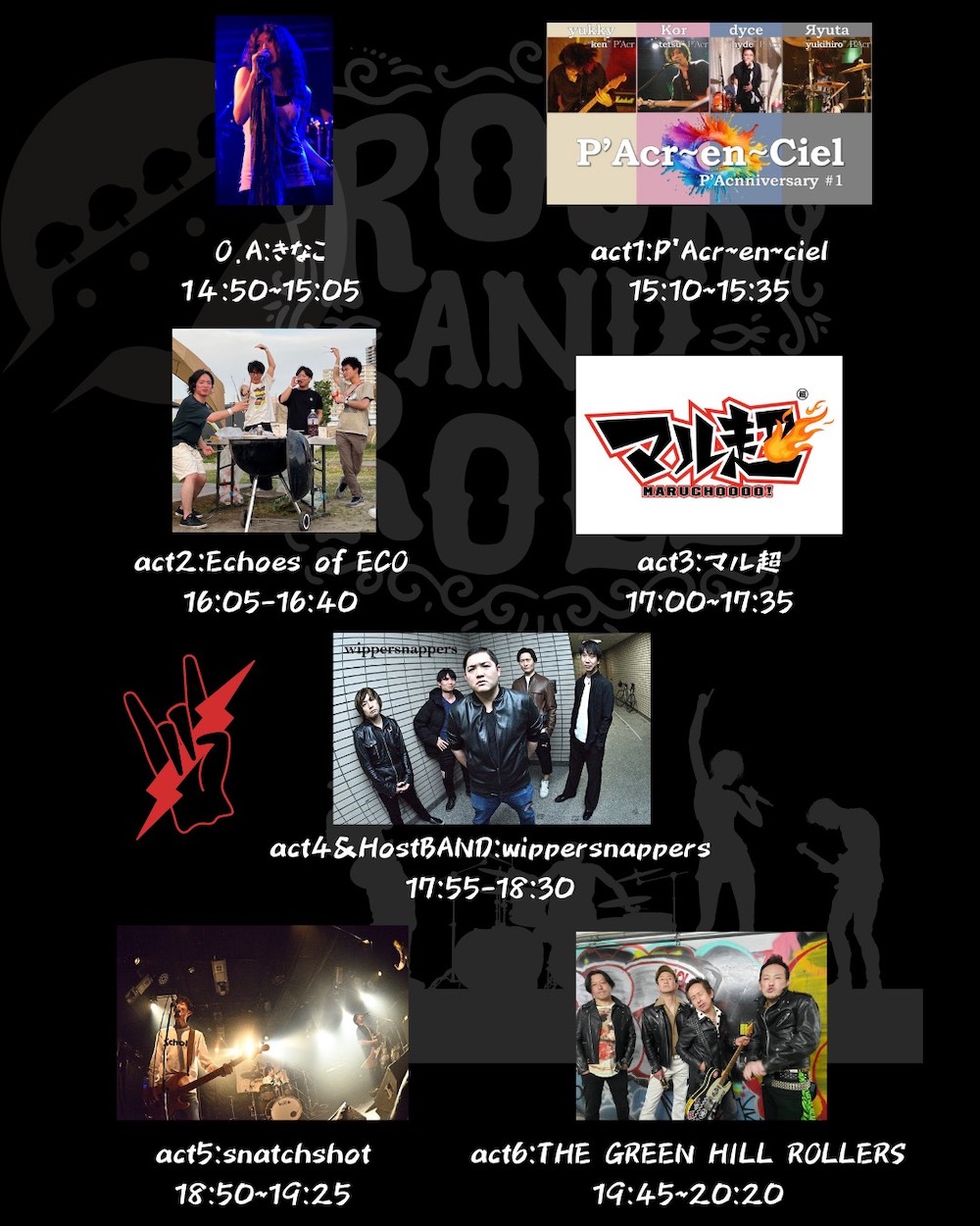 出演者 THE GREEN HILL ROLLERS snatch shot wippersnappers マル超 Private Bibles P'Acr〜en〜ciel きなこさん (O.A) OPEN 14:45 / START 14:50 1500円 + 1drink代600円