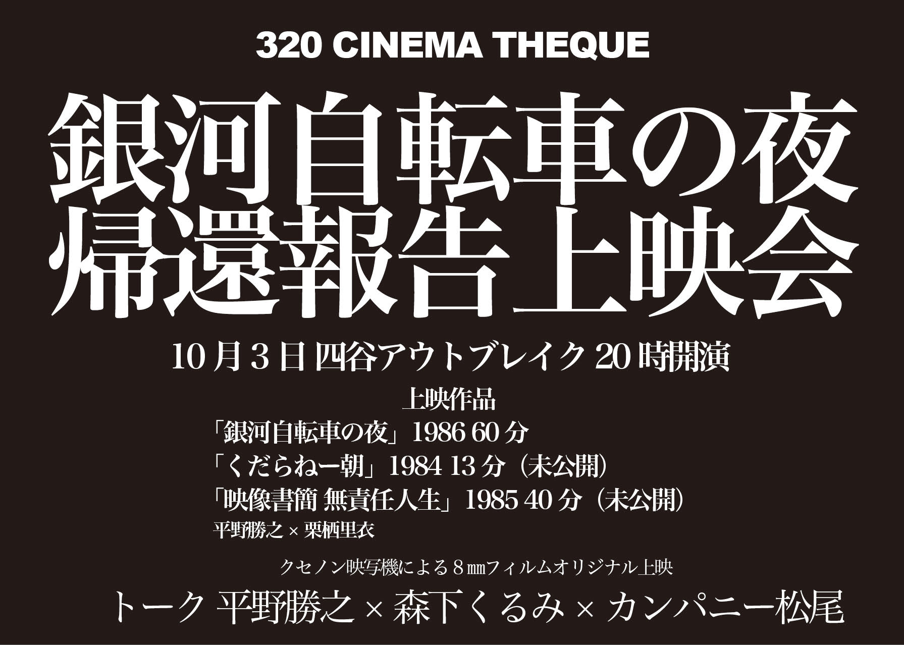 無事に(たぶん)撮影を終え(推定)帰還した直後の記念報告イベントになります。新作である「銀河自転車の夜2019」(この段階ではもちろん完成していない)の元ネタである1986年の「銀河自転車の夜」と、本邦初公開である同80年代に、当時札幌在住であった栗栖里衣さんとの映像書簡(8㎜映像による交換日記)「無責任人生」と、同じく未発表の「くだらねー朝」の3本を特設スクリーンを設置、クセノン球による映写機にてオリジナル上映。320CINEMATHEQUE(320は8㎜フィルム1本分は3分20秒である事から命名された)の豪華版、未発表平野作品2本含む大8㎜映画大会です!また、ゲストには、お馴染みの森下くるみさん、そしてハメ撮りAV監督の巨匠、カンパニー松尾さんを迎えトークにて旅の様子、映画の撮影の様子などを報告させていただきます!実際に旅してきた自転車、アルプス・ローバーや日記、地図なども展示する予定です。