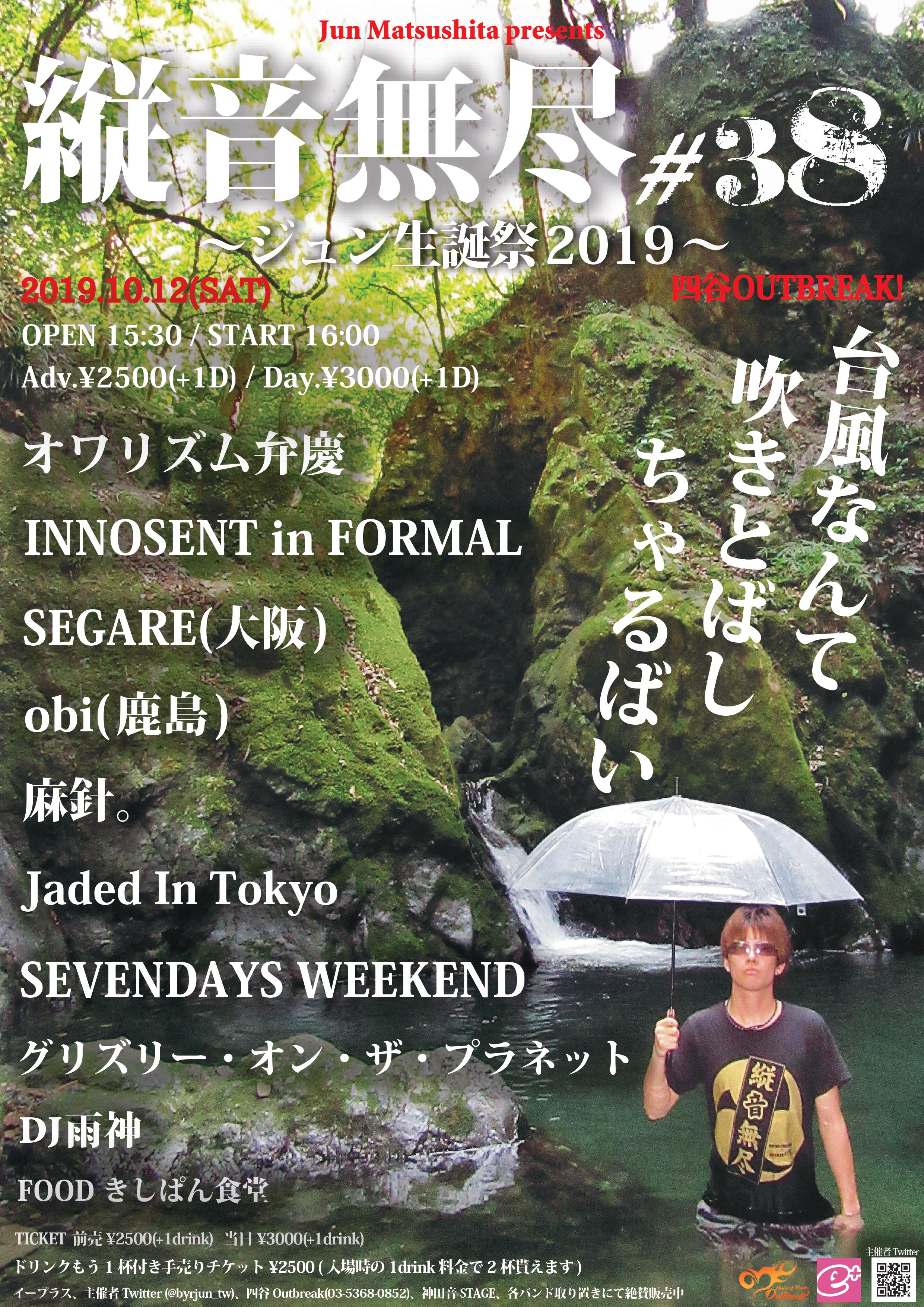出演者 オワリズム弁慶 INNOSENT in FORMAL SEGARE(大阪) obi(鹿島) JADED IN TOKYO グリズリー・オン・ザ・プラネット SEVENDAYS WEEKEND 麻針。 DJ雨神 FOOD きしぱん食堂 OPEN 15:30 / START 16:00