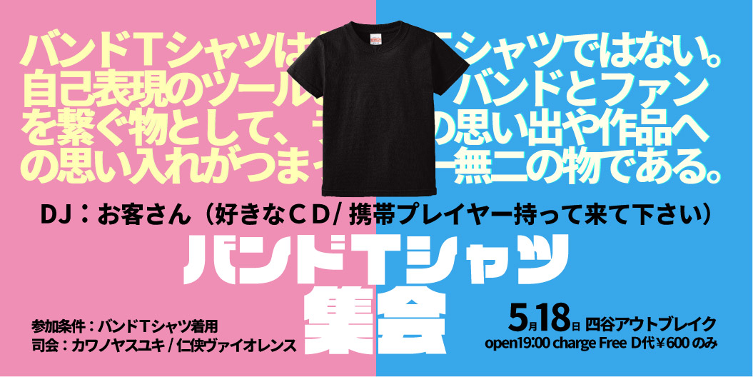 好きなバンドTシャツを着て飲んだりお喋りしたりするイベントです!音源持って来てもらえればガンガンかけます!DJはお客さんです!!