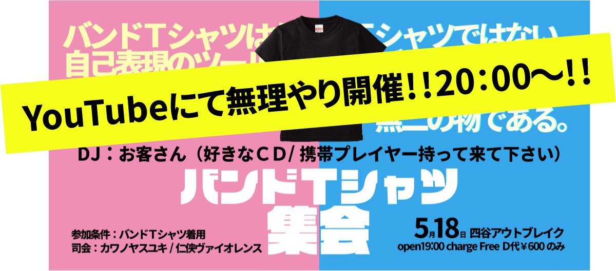 バカバカしい本気の無観客トーク配信です。ゲストに下北251の仁侠さんとGEEKSTREEKSからカワノくんを迎えてバンドTシャツトークします。それぞれ秘蔵のバンTを持って来てくれるのでお楽しみに!
