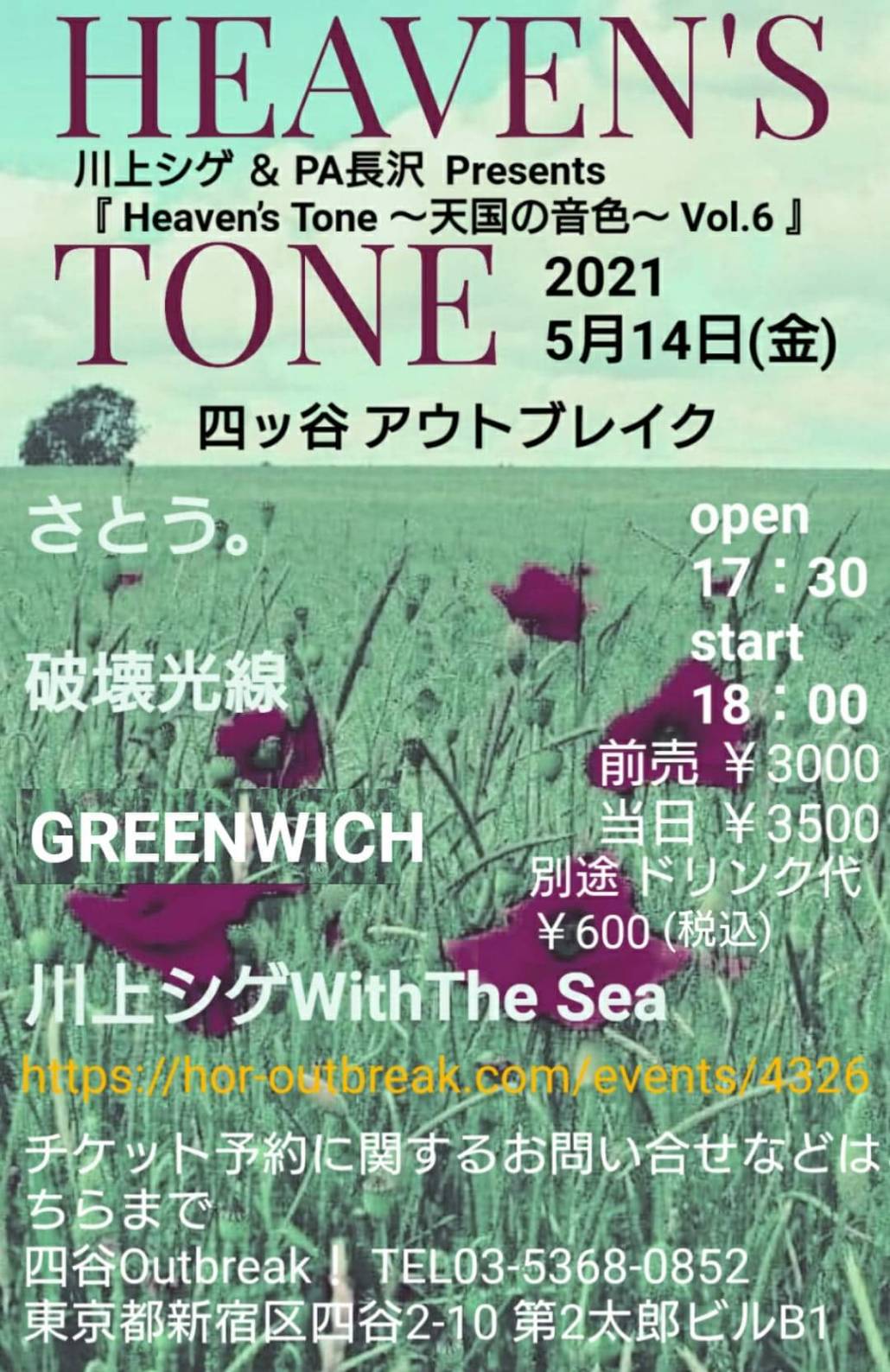 前売 ¥3000 当日 ¥3500 ※別途入場時にドリンク代 ¥600 を頂きます。