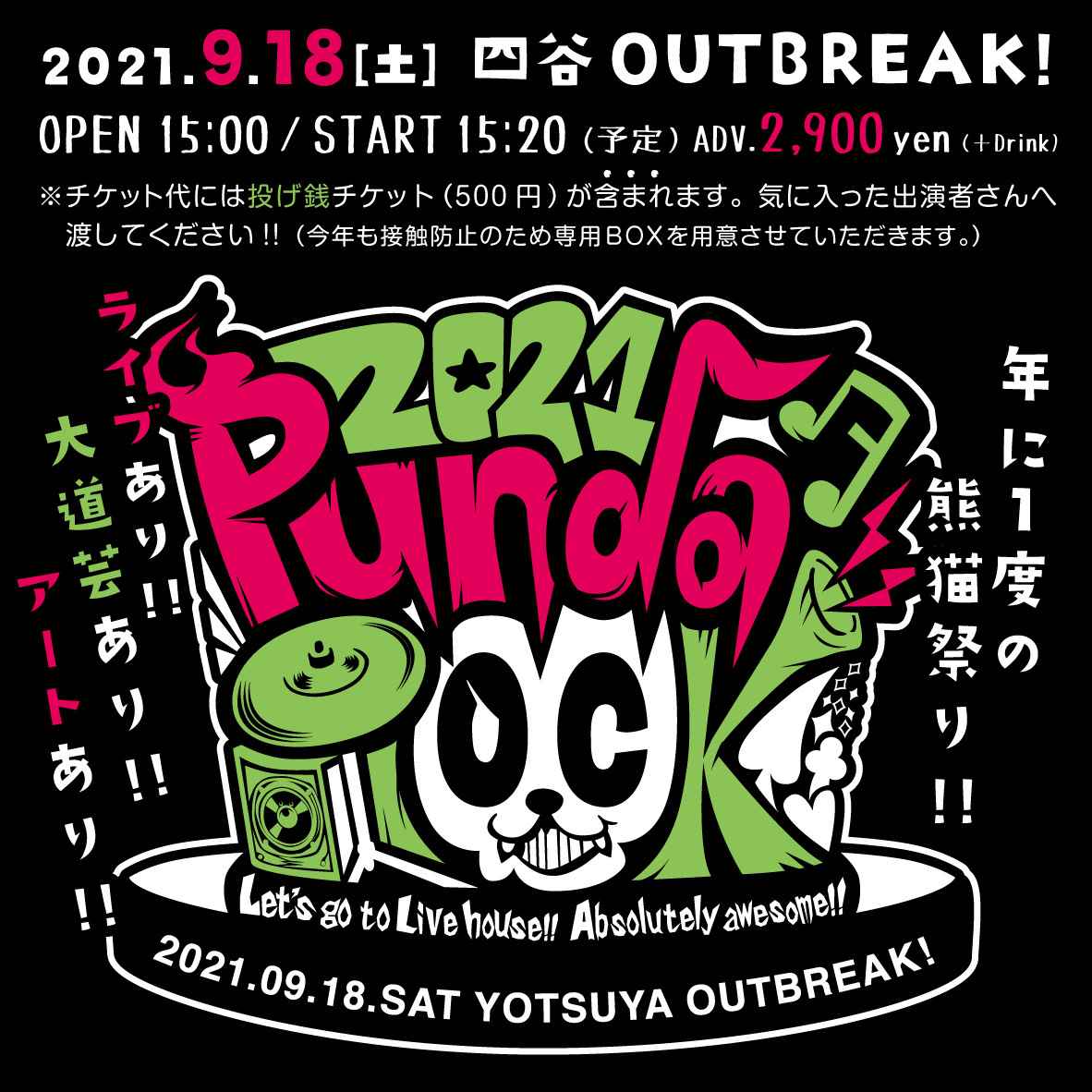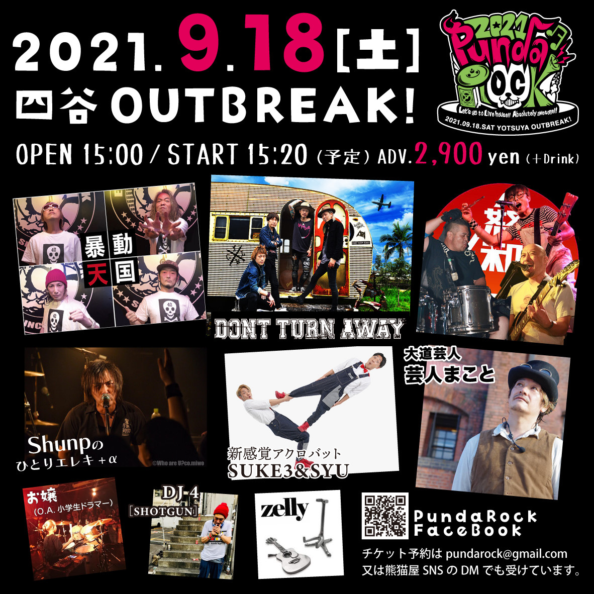 出演者 DONT TURN AWAY 怒和 shunpのひとりエレキ+α 暴動天国 お嬢 芸人まこと【大道芸】 SUKE3&SYU【大道芸】 zelly【ART】 【DJ】 DJ 4(SHOTGUN) OPEN 15:00 / START 15:30 ticket ¥2,900(+D)