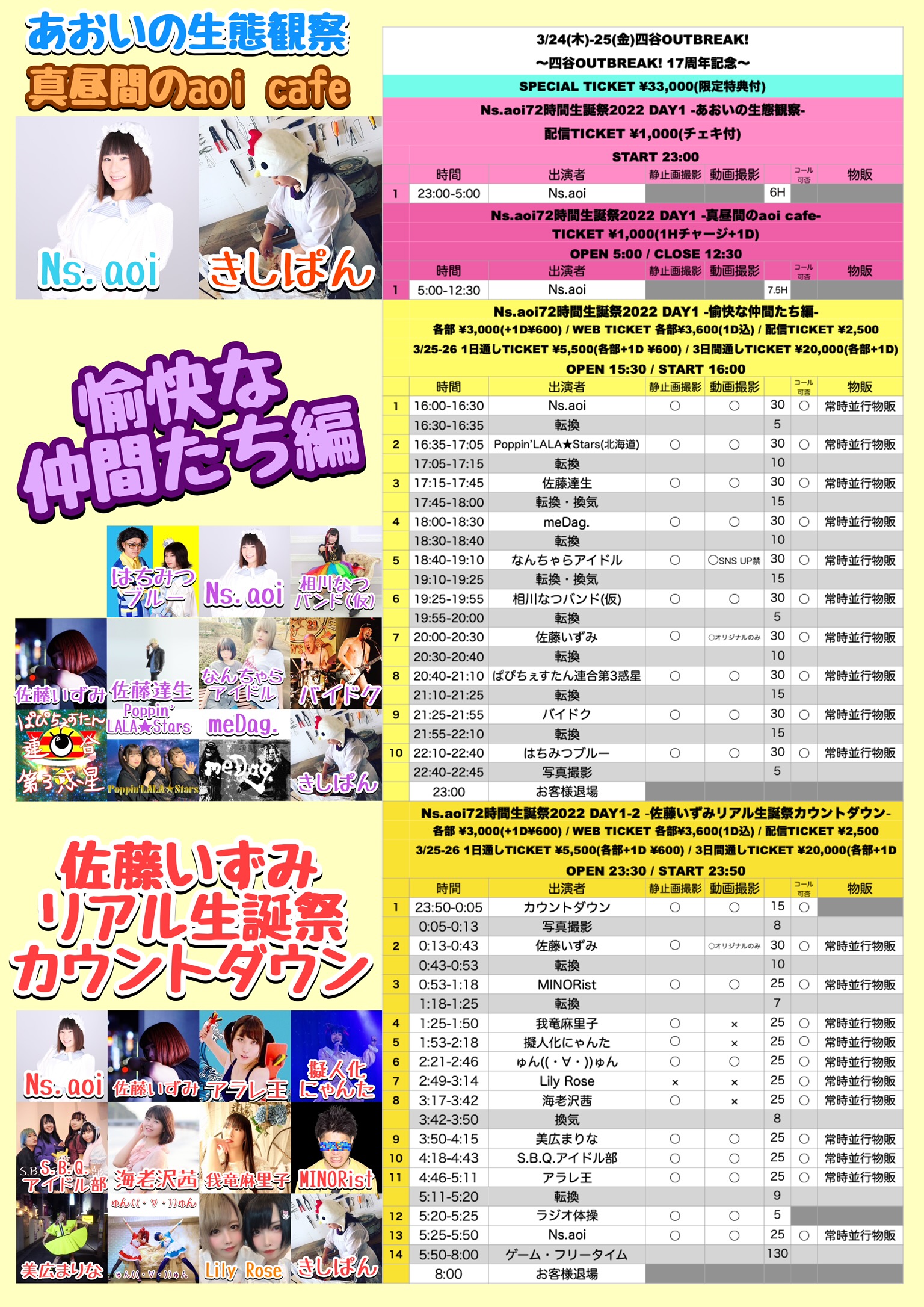 3/25 四谷OUTBREAK! 〜四谷OUTBREAK! 17周年記念〜 Ns.aoi72時間生誕祭2022 DAY1 -真昼間のaoi cafe- w / Ns.aoi / きしぱん OPEN 5:00