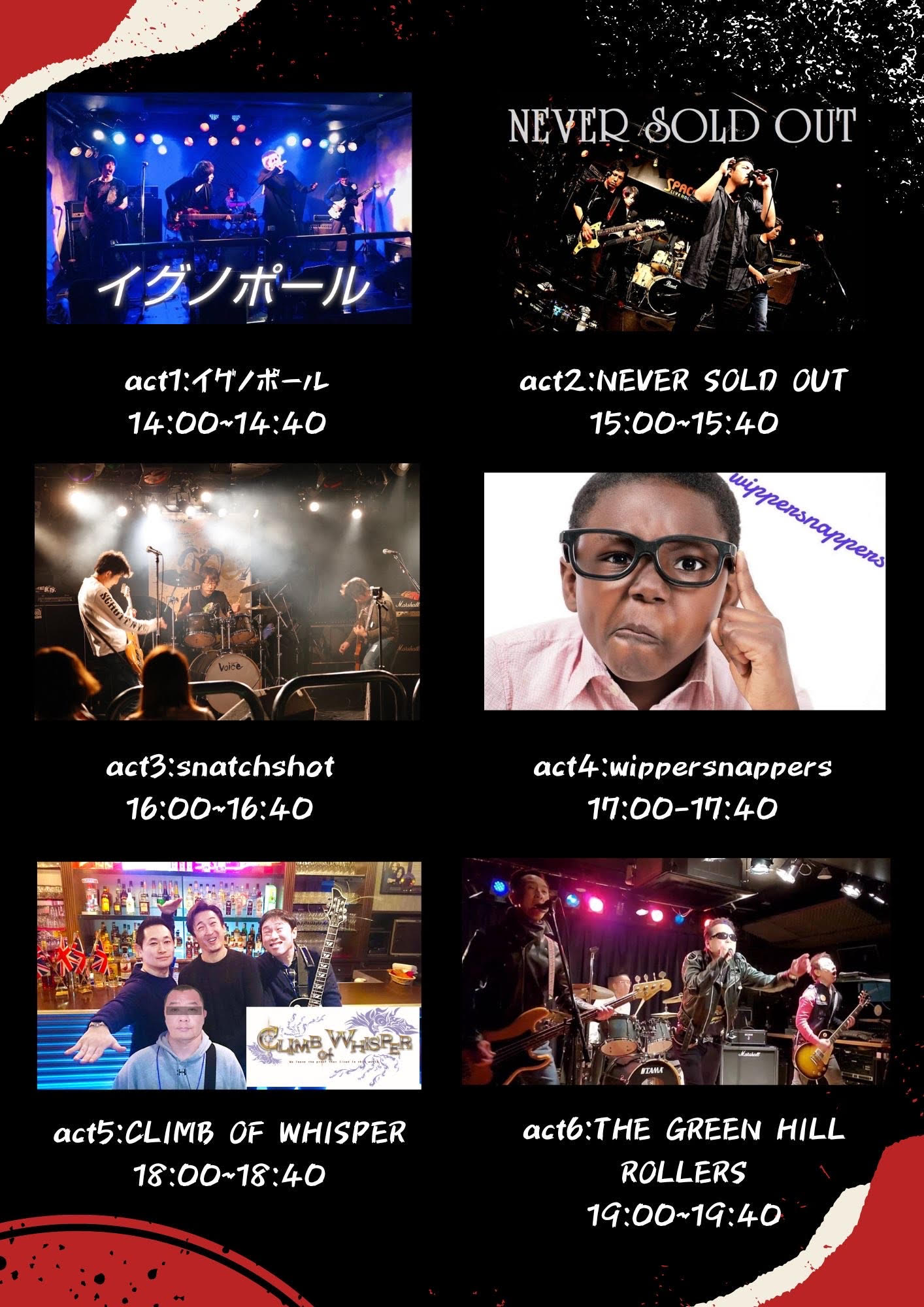 出演者 THE GREEN HILL ROLLERS wippersnappers NEVER SOLD OUT イグノポール climb of whisper snatchshot OPEN 13:45 / START 14:00 入場無料 + 2ドリンク1,200円 (高校生以下無料)
