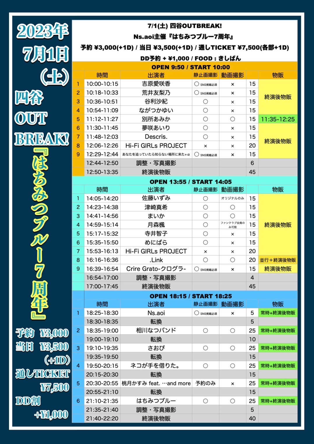 予約 3,000円 / 当日 3,500円(+1D) / 通しTICKET ¥7,500(各部+1D) / DD割 +¥1,000